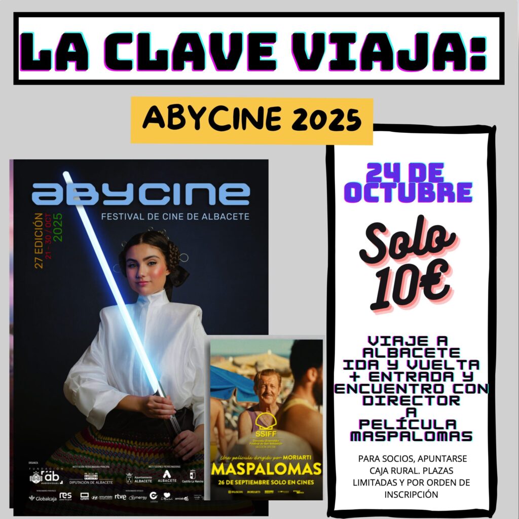 Viaje 24 de Octubre, Viaje al Festival de Cine de Albacete Abycine. 24/10/2025 La proyección será el viernes 24 de octubre a las 22:00 h en el Teatro Circo de Albacete. Salimos …